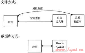 在這兩種方式中間形成了一種過渡方式:即建立一個同關(guān)系數(shù)據(jù)庫的中間處理平臺,比如MapInfo的SpatialWrae產(chǎn)品,通過它將空間數(shù)據(jù)庫存放在關(guān)系型數(shù)據(jù)庫中。