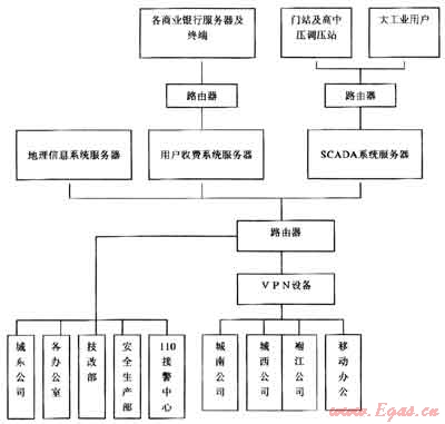 硬件網(wǎng)絡(luò)以地理信息系統(tǒng)服務(wù)器、用戶收費(fèi)系統(tǒng)服務(wù)器和SCAD系統(tǒng)服務(wù)器為核心,采用一條50M和一條8M專用光纜與電信運(yùn)營商連接,50M光纜分兩區(qū),其中16M帶寬用于收費(fèi)服務(wù)器與8家聯(lián)網(wǎng)收費(fèi)銀行聯(lián)系傳遞信息,34M帶寬用于辦公網(wǎng)絡(luò)上互聯(lián)網(wǎng)和燃?xì)饩C合管理系統(tǒng)、用戶收費(fèi)系統(tǒng)、SCAD系統(tǒng)通過VPN設(shè)備與遍布市區(qū)的東南西北四個分公司及營業(yè)服務(wù)廳聯(lián)網(wǎng)。8M光纜專門用于與各SCAD系統(tǒng)遙測遙控點(diǎn)數(shù)據(jù)傳輸和與集團(tuán)公司SCAD控制中心數(shù)據(jù)交換(通過互聯(lián)網(wǎng))。