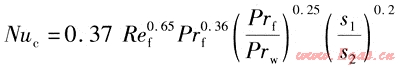 在設(shè)計(jì)過(guò)程中,傳熱系數(shù)的計(jì)算只能依靠經(jīng)驗(yàn)公式,對(duì)于流體橫掠光管和翅片管的情況都要考慮。光管管束的計(jì)算使用茹卡烏斯卡斯總結(jié)出的平均表面?zhèn)鳠嵯禂?shù)的關(guān)聯(lián)式[5],螺旋翅片和整體翅片管束分別使用Briggs和Young的關(guān)聯(lián)式和Gray和Webb關(guān)聯(lián)式[6]。