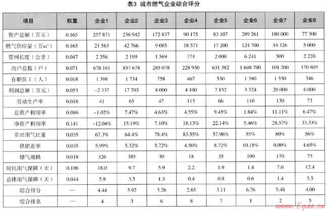 根據(jù)已經(jīng)建立的評價體系,我們對國內(nèi)12家運(yùn)營較規(guī)范燃?xì)馄髽I(yè)進(jìn)行了調(diào)研,并從中選擇數(shù)據(jù)反饋完整的8家企業(yè)進(jìn)行比較。根據(jù)8家企業(yè)經(jīng)營指標(biāo)(截止至2010年底)的相對優(yōu)劣,分別計算每個企業(yè)每個項(xiàng)目得分(0分-10分),各項(xiàng)加權(quán)匯總后為企業(yè)綜合得分。(見表3)
