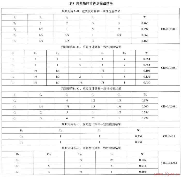 我們在調(diào)研中反復(fù)向業(yè)內(nèi)專家咨詢,綜合各位專家意見,并結(jié)合調(diào)研數(shù)據(jù),建立了判斷矩陣,并根據(jù)層次分析的一般方法(和積法),計算各要素的權(quán)重和進(jìn)行一致性檢驗(yàn)。限于篇幅,計算過程不詳細(xì)敘述,結(jié)果見表2。