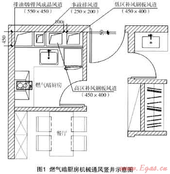 第二方案,燃?xì)獍祻N房設(shè)置排油煙系統(tǒng)、事故排風(fēng)系統(tǒng)、補(bǔ)風(fēng)系統(tǒng):燃?xì)庑孤﹫?bào)警及排油煙/排風(fēng)機(jī)出現(xiàn)故障時(shí),聯(lián)動(dòng)切斷燃?xì)夤艿拦?yīng)的總閥門,所有通風(fēng)設(shè)備均為防爆設(shè)備。采用了很多主動(dòng)技術(shù)來加強(qiáng)通風(fēng),如圖1、圖2所示: