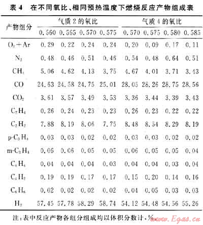 從表2也可以看出,在相同反應(yīng)條件下,隨著從氣質(zhì)1至氣質(zhì)4有機(jī)碳總量的增加,裂化產(chǎn)物中乙炔含量不斷增加,而剩余甲烷含量并未減少,反而呈增加趨勢,這也說明了在相同耗氧量的情況下,氣質(zhì)4裂解生成乙炔的能力更高。但另一方面也可以看出,裂解產(chǎn)物中合成氣(H2+CO)含量在減少,這也充分說明了乙炔產(chǎn)量的增加是以合成氣的減少為代價(jià)的。