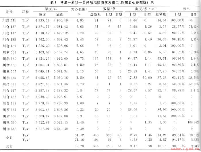 為便于統(tǒng)計(jì)將該區(qū)巖心裂縫按角度大小分為Ⅰ型、Ⅱ型兩種,工型指低角度裂縫(<45°,含水平裂縫),Ⅱ型指高角度裂縫(≥45°,含垂直裂縫)。對(duì)該區(qū)8口重點(diǎn)井的巖心進(jìn)行了觀察,并選擇其中典型段的52.28m作了細(xì)致識(shí)別與統(tǒng)計(jì),結(jié)果如表1所示。