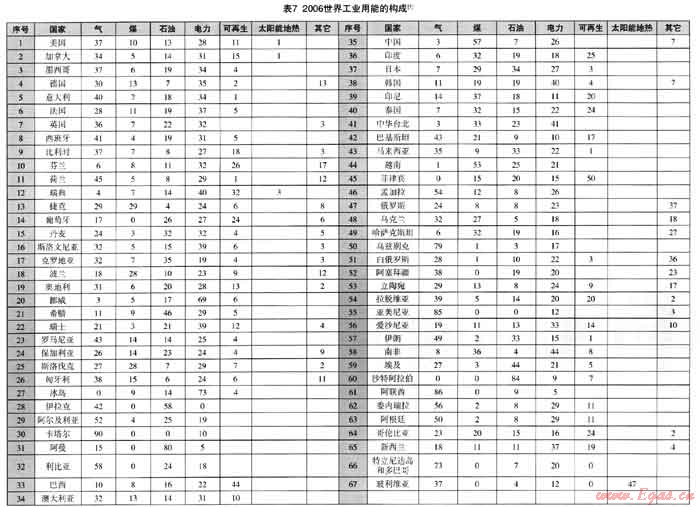(5) 本文所引用的資料均是本世紀以來值得研究的數(shù)據(jù),從中可看出世界各國對本世紀能源構(gòu)成的共同發(fā)展方向。在化石燃料中,由于天然氣的碳/氫比較小,是唯一能滿足節(jié)能、減排要求的燃料,常稱為環(huán)境友好燃料。在世界各國的能源構(gòu)成中,我國是所占比重最低的國家之一,改革開放以來的變化也很小。增加1000億m3的天然氣,相當于1.2億t的標準煤,按表2可算出燃料效率提高后的節(jié)能量和C02減排量。當今世界年消耗天然氣約2.48億m3,相當近29億t標煤,在世界能源、減排中有舉足輕重的作用,到2030年估計全球天然氣消費料將達4.5億m3-5億m3。國際研究表明,加上可再生能源,新能源和其它減排措施后,全球C02的濃度可能降低到1990年水平的要求。本世界以來天然氣已形成了較大的國際市場,發(fā)展天然氣已成為各國應對氣候變暖的首選方案。我國在國家“十二五”規(guī)劃綱要中已有反映。