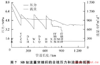 SB站流量突增后的全線壓力和流量曲線圖如圖7所示。從圖7可以看出,當SB站的氣量突然增加后,SB站的出站壓力迅速上升,其他站的壓力和流量變化幅度不大。