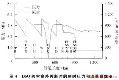 輸氣管道干線截斷閥(DSQ閥室)意外關斷時,管道的瞬時壓力和流量趨勢如圖4所示。從圖4可以看出,DSQ閥室意外關斷后,該閥室的天然氣通過量瞬間下降至零,上下游的流量下降均較快,入站壓力上升,出站壓力下降。長此以往將影響到上游壓縮機的運行、下游用戶的分輸量以及全線的輸氣量,最后導致全線停運。