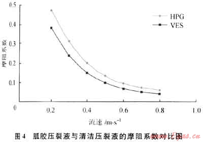 這種新型的溶液的結構具有良好的可逆性,當高剪切時,結構解體;剪切速率降低后,結構又重新恢復。采用自研環(huán)路實驗裝置測定的流動摩阻如圖4所示:在同等條件下VES壓裂液摩阻系數比胍膠壓裂液低,有利于降低施工摩阻減小施工壓力。
