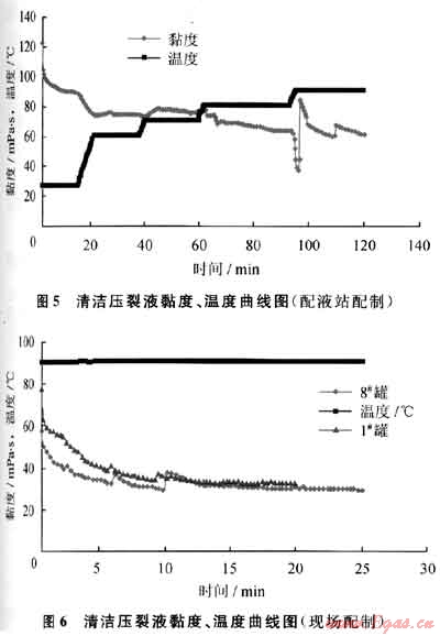 為確保壓裂液質量,分別取配液站配制和現場配制壓裂液采用HAAKE-VT550流變儀進行實驗評價(圖5、6)。由圖可見,采用配液站罐內水配制的清潔壓裂液黏度比配液站清水配制的清潔壓裂液黏度低50%(從60mPa·s下降至30mPa·s),說明水質對清潔壓裂液黏度影響很大,但仍能滿足壓裂要求。