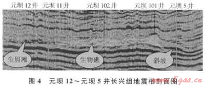 元壩地區(qū)長興組某方向的地震剖面(圖4)顯示地震相特征主要表現(xiàn)為臺(tái)地邊緣淺灘相、臺(tái)地邊緣生物礁相及礁前斜坡相,與測井相所反映的沉積特征一致。臺(tái)地邊緣生物礁為“低頻、弱振幅、內(nèi)部雜亂、透鏡狀反射結(jié)構(gòu)”地震相特征[7],一般外形上頂部上拱隆起形成披蓋構(gòu)造和側(cè)面上超形態(tài),呈丘狀,這與臺(tái)地邊緣生物礁沉積體的“含弱反射的隆起”特征類似,為典型生物礁沉積特征,如元壩102、元壩101井區(qū)地震相沉積特征。臺(tái)地邊緣淺灘,常發(fā)育碎屑灘,這些碎屑顆粒往往是由海浪拍打生物礁形成的,地震剖面上呈“斷續(xù)、斜交、中強(qiáng)振幅反射”的地震相特征,如元壩12、元壩11井井區(qū)為礁后淺灘沉積特征。臺(tái)地邊緣往陸棚過渡,水動(dòng)力條件逐漸減弱,巖性泥質(zhì)含量增多,反射波組呈平行、亞平行反射,并有同相軸增多現(xiàn)象,如元壩5井井區(qū)為礁前斜坡沉積特征。