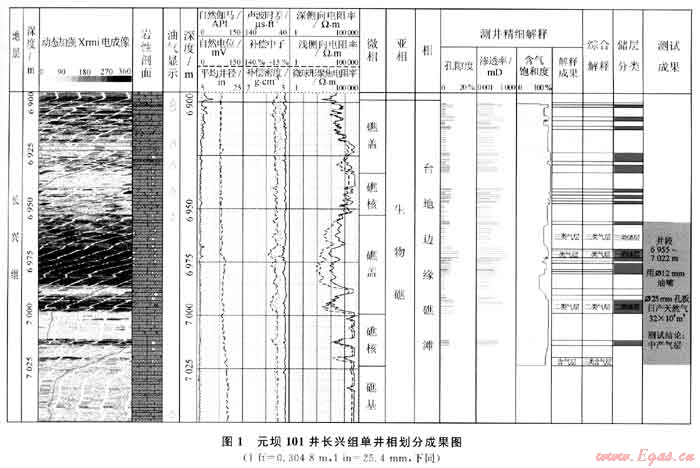在區(qū)域地質(zhì)背景分析的基礎(chǔ)上,綜合利用成像測井、常規(guī)測井及巖屑薄片鑒定等資料,結(jié)合實(shí)際鉆探成果進(jìn)行了研究區(qū)長興組的單井相劃分。以元壩101井單井相劃分為例(圖1),圖中顯示該段地層自然伽馬低值,約10API,巖性純,以淺灰色白云巖、溶孔白云巖及生屑灰?guī)r為主,夾有云質(zhì)灰?guī)r和含云灰?guī)r;成像圖像上可見6900~6925m和6950~7000m裂縫及溶蝕孔洞非常發(fā)育,對應(yīng)的孔隙度曲線明顯增大,儲(chǔ)集物性好,電阻率曲線較致密圍巖明顯降低,呈大幅度正差異特征,儲(chǔ)層滲透性好。這些特征反映當(dāng)時(shí)的沉積水體相對較淺,沉積水體能量較強(qiáng),白云巖化作用較強(qiáng),易形成溶蝕孔洞白云巖儲(chǔ)層,為臺(tái)地邊緣生物礁儲(chǔ)層沉積特征。取心資料顯示,該井段含有大量生物碎屑,這些生屑多為有孔蟲類、腕足類及鰱的化石,而這些生物正是區(qū)域上長興組沉積時(shí)期生物礁的附礁生物[2];結(jié)合研究區(qū)所有單井的長興組沉積相分析結(jié)果,綜合認(rèn)為該地層屬于臺(tái)地邊緣礁灘相沉積。