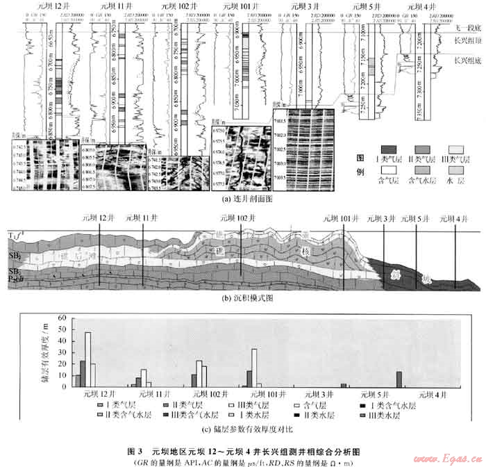 曲線特征及連井相對比分析表明,不同的沉積相帶測井特征存在較大差異(圖3),元壩12、元壩11井長興組自然伽馬平均值為15API,巖性為淺灰色生屑灰?guī)r、深灰色含云生屑灰?guī)r,儲(chǔ)集物性較好,成像圖上裂縫及溶蝕孔洞發(fā)育,取心見鰱類化石、海綿骨針、苔蘚蟲、有孔蟲等,測井相為臺(tái)地邊緣礁灘相,亞相為礁后淺灘,有利于儲(chǔ)層發(fā)育的沉積微相為生屑灘和砂屑灘.元壩102、元壩101井長興組自然伽馬平均值為10API,巖性以白云巖、灰質(zhì)云巖及云質(zhì)灰?guī)r為主,儲(chǔ)集物性好,成像圖上高角度縫、網(wǎng)狀縫及溶蝕孔洞發(fā)育,取心見孔蟲類、腕足類及筵的化石等,測井相為臺(tái)地邊緣礁灘相,亞相為生物礁,具有利于儲(chǔ)層發(fā)育的礁蓋和礁核沉積微相特征;而過渡到元壩3~元壩4井長興組自然伽馬逐漸增大,平均值由21API增加至27API,泥質(zhì)含量相對較重,巖性以含泥灰?guī)r為主,儲(chǔ)集物性差,成像圖上層理發(fā)育,儲(chǔ)層不發(fā)育,其測井相為斜坡-淺水陸棚沉積[6]。同時(shí),儲(chǔ)層參數(shù)橫向?qū)Ρ?圖3-c)反映元壩12~元壩101井儲(chǔ)層發(fā)育,儲(chǔ)集物性好,以Ⅱ、Ⅲ類儲(chǔ)層為主,儲(chǔ)層含氣性好,測試獲得天然氣產(chǎn)能為30×104~120×104m3/a,可能為臺(tái)地邊緣礁灘相沉積特征。