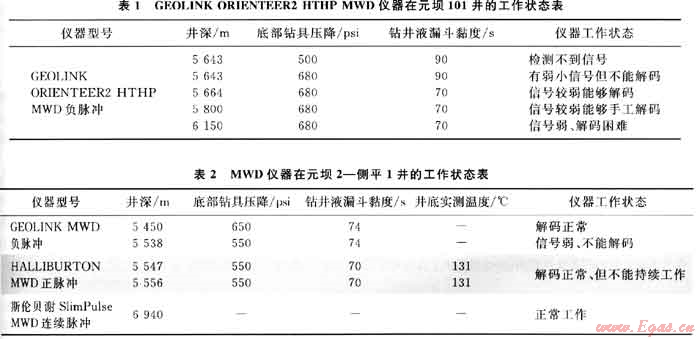3) 總結(jié)了如下的儀器使用準(zhǔn)則:垂深在5000m以?xún)?nèi)的井,有很多MWD儀器可供選擇;垂深介于5000~6000m的井,如果井底溫度不超過(guò)130℃、井底循環(huán)動(dòng)壓不超過(guò)17000psi,HALLIBURTON公司生產(chǎn)的MWD儀器以其工作的穩(wěn)定性高得到比較普遍的認(rèn)可,若溫度或壓力超過(guò)這個(gè)指標(biāo),則可用BAKER HUGHES公司生產(chǎn)的MWD儀器或GE公司生產(chǎn)的GEOLINK MWD儀器;垂深大于6000m時(shí),推薦使用BAKER HUGHES公司生產(chǎn)的MWD儀器或GE公司生產(chǎn)的GEOLINK MWD儀器,若溫度進(jìn)一步升高或改良脈沖信號(hào)的措施無(wú)法實(shí)施時(shí),則要引入抗溫性能更高的MWD儀器。
