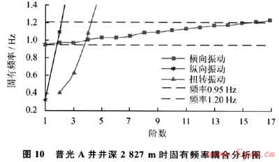 1) 鉆柱扭轉(zhuǎn)振動和縱向振動固有頻率數(shù)值較大,各階固有頻率之間間隔較大,可選擇的安全轉(zhuǎn)速范圍較寬;但橫向振動低階固有頻率數(shù)值很小且各階固有頻率之間間隔很小,可選擇的安全轉(zhuǎn)速范圍較窄。