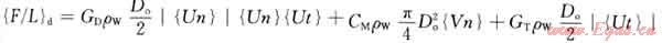 式中{F/L}d表示由于液體動力效應(yīng)引起的單位長度上的載荷;CD表示法向阻力系數(shù);ρw表示外部液體的密度;Do表示管柱實(shí)際外徑;{Un}表示法向相對速度矢量;CM表示慣性系數(shù);{Vn}表示法向加速度矢量;CT表示切向阻力系數(shù);{Ut}表示切向上相對速度矢量。
