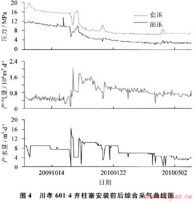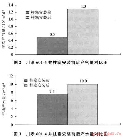 川孝601-4井施工前產(chǎn)氣0.5×104m3/d,產(chǎn)水7.5m3/d;施工后產(chǎn)氣1.3×104m3/d,產(chǎn)水10m3/d,增產(chǎn)天然氣0.8×104m3/d,排水采氣效果顯著。綜合采氣曲線可以看出:該井自安裝柱塞氣舉以來,油套壓差減小,產(chǎn)氣量顯著增加,排水采氣效果明顯。柱塞氣舉安裝前后產(chǎn)量對(duì)比如圖2、3所示,柱塞安裝前后綜合采氣曲線如圖4所示。