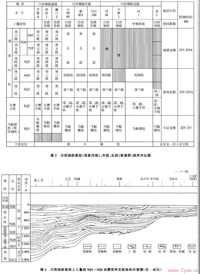 值得指出的是,大邑地區(qū)須三段底(即中國(guó)石化認(rèn)為的T51界面)對(duì)下伏層的削截在大邑至灌口一帶十分明顯。由于龍門山構(gòu)造帶從NE→SW逐次抬升,須六、須五段依次遭剝蝕。川西坳陷的北、中、南段SQ1~SQ6層序?qū)Ρ热鐖D3所示[6];展示坳陷的中段、北段各層序均可對(duì)比。