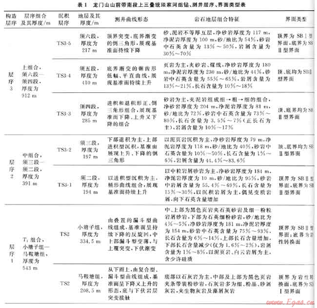 過(guò)去習(xí)慣上把上三疊統(tǒng)劃分為6段,其中一、三、五段為頁(yè)巖夾可采煤層的煤系地層,稱為富煤段;二、四、六段為砂巖,是富砂段也是含油氣的儲(chǔ)集層。據(jù)3條SBⅠ型層序界面劃分了3套構(gòu)造層序,據(jù)SBⅡ型層序界面和水泛面劃分了6套沉積層序(S01~S06),在層序內(nèi)識(shí)別了巖性轉(zhuǎn)換面,據(jù)此建立了上三疊統(tǒng)的層序地層剖面(圖1),須家河組各層序鉆、測(cè)井層序、界面類型見(jiàn)表1。