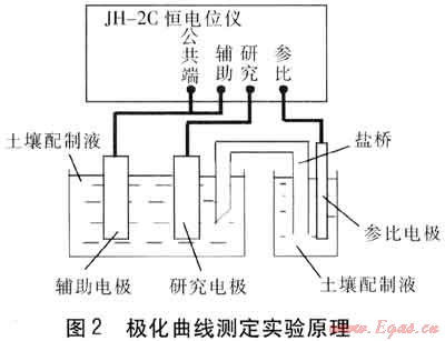 管道的致鈍電流密度、維鈍電流密度、穩(wěn)定鈍化區(qū)電位范圍的測定方法采用恒電位法[4]。恒電位法就是將研究電極依次恒定在不同的值,然后測量對應于各電位下的電流。極化曲線的測量應盡可能接近體系穩(wěn)態(tài)。體系穩(wěn)態(tài)指被研究體系的極化電流、電極電位、電極表面狀態(tài)等基本上不隨時間而改變。在實際測量中,常用的控制電位測量方法有動態(tài)法,控制電極電位以較慢的速度連續(xù)地改變(掃描),并測量對應電位下的瞬時電流,以瞬時電流與對應的電極電位作圖,便獲得整個極化曲線。測量在實驗室進行,需要恒電位儀1臺,飽和甘汞電極1支,Q235A鋼制作的電極1支,鉑電極1支,三室電解槽1只,2L現(xiàn)場土壤配制液,0.5mol/L的H2S04溶液2L,0.85mol/L的丙酮水溶液1.5L。用金相砂紙將Q235A鋼制作的測試電極打磨至鏡面光亮,用石蠟蠟封,留出1cm2面積,然后在丙酮水溶液中除油,在0.5mol/L的H2S04溶液中去除氧化層,浸泡時間分別不低于10s,然后按圖2進行安裝。圖2中,選用JH-2c恒電位儀作為恒電位的輸出,參比電極選用飽和甘汞電極,輔助電極選用鉑電極,研究電極為Q235A鋼制作的測試電極。保持25℃環(huán)境,測量方法采用動態(tài)法。