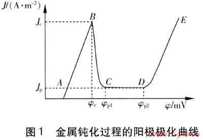 圖1為典型的鈍性金屬鈍化過程的陽極極化曲線。圖1中,橫坐標表示陽極極化電位φ(單位為mV),縱坐標表示電流密度1,(單位為A/m2),AB段金屬發(fā)生活性溶解,稱為活化區(qū),在A點,金屬為自然腐蝕狀態(tài),在靠近曰點附近,電極極化過程受到阻礙,可能產(chǎn)生氧化物的薄膜;在BC段,保護膜的生長速度已超過化學溶解速度,形成保護膜,這一區(qū)稱為鈍化過渡區(qū),到C點時,整個表面已被吸附氧化膜所覆蓋;在CD段,陽極電流與電位往往沒有關系,這一區(qū)為穩(wěn)定狀態(tài),稱為穩(wěn)定鈍化區(qū)。隨著電位的升高,膜中氧的含量增加,膜隨之變厚;在DE段,D點的電位相當于氧的陽極析出電位,氧化膜被氧化成可溶性的高價氧化物,金屬又開始溶解,這一區(qū)域稱為過鈍化區(qū)。