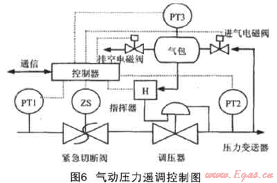 CS壓力遙調(diào)通過導(dǎo)壓管引入外部壓力,通過控制一個氣包的進、出口電磁閥來調(diào)節(jié)氣包內(nèi)的壓力,進而可以控制指揮器噴嘴噴出的燃氣壓力,最終控制調(diào)壓器的出口壓力,如圖6[2]。