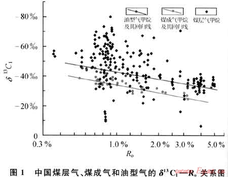 天然氣的甲烷碳同位素值主要受控于原始母質(zhì)類型和后期改造程度,煤層氣與常規(guī)天然氣碳同位素值的差異主要是由于煤層氣具有獨(dú)特的后期改造特征。常規(guī)天然氣甲烷碳同位素值主要受到母質(zhì)和烴源巖熱演化程度(Ro)的影響,相同成熟度條件的烴源巖,煤成氣比油型氣的δ13C1要重,同一母質(zhì)類型的天然氣δ13C1隨著成熟度的增加而變重(圖1);常規(guī)天然氣的后期改造,除典型生物氣外,我國已發(fā)現(xiàn)的大中型煤成氣氣藏受到生物降解的影響較小,對甲烷碳同位素值的影響不大。而煤層氣,由于氣源來自煤巖本身,甲烷碳同位素值除了受烴源巖成熟度影響外,后期的解吸作用、生物作用和水動(dòng)力作用是主要的影響因素。煤層氣為吸附氣,后期吸附解吸過程中,13CH412CH4難解吸,從而發(fā)生同位素的分餾效應(yīng),造成同位素值的變化[32];目前工業(yè)開采利用的煤層氣藏一般埋深淺于2000m,生物降解作用使得烴源巖成熟度相近的煤層氣較常規(guī)煤成氣的甲烷碳同位素值偏輕[28,33~34];煤層氣受水動(dòng)力條件影響也較大,其作用機(jī)制為甲烷通過水溶作用而改變同位素的組成[35]。