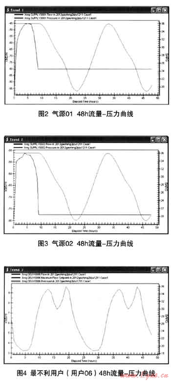 為保證至用戶11的最低壓力不低于3.5MPa,模擬過(guò)程中對(duì)流量調(diào)節(jié)閥的參數(shù)進(jìn)行了設(shè)置,確保其閥前壓力不低于3.5MPa。各氣源點(diǎn)及最不利用戶(用戶06)的48h流量-壓力曲線如圖2、圖3、圖4所示。從模擬計(jì)算結(jié)果可以看出,在增加電廠用氣的情況下,2012年采用高壓管道儲(chǔ)氣調(diào)峰能夠滿足要求,管網(wǎng)最不利點(diǎn)用戶的最小運(yùn)行壓力為1.86MPa。