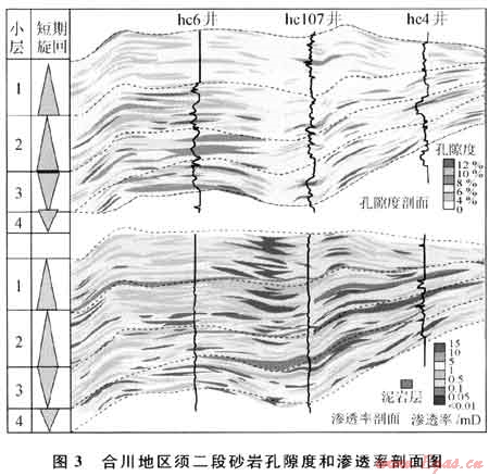 通過建立四川盆地須家河組層序地層格架(圖1),針對合川地區(qū)開展須二段砂巖精細(xì)小層對比(自上而下劃為1~4個小層)和相控隨機(jī)模擬儲層預(yù)測綜合研究。研究成果顯示(圖3),須二段各小層之間泥巖隔層不發(fā)育,主要發(fā)育含泥細(xì)粒粉砂質(zhì)物性隔層,其內(nèi)部大量致密砂巖分隔體(層)與中高孔滲砂體相互“滲透”和交叉分布。