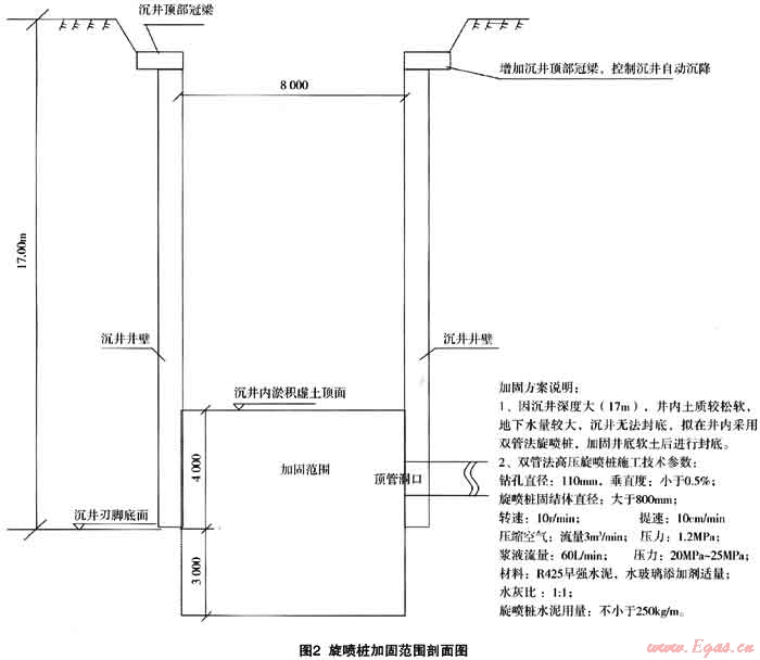要加固沉井內(nèi)虛土,首先想到的是旋噴樁。眾所周知,旋噴樁是一種適合于加同軟土的很好地基處理方法,但其施工一般是在地面上進行。旋噴樁若要在深度達17m、而其中上部還要架卒約13m的沉井內(nèi)施工卻是從未曾有人嘗試過。旋噴樁施工隊伍也擔(dān)心架空13m可能無法施工、加固效果很難保證。經(jīng)過仔細分析,我們大膽提出,只要采取的措施得法,旋噴樁是可以用于加固沉井內(nèi)虛土并起到止水作用的。通過現(xiàn)場指導(dǎo)施工,落實各項施工措施,最終證明,旋噴樁加固效果良好,虛土加固后,井底未出現(xiàn)涌砂、涌土現(xiàn)象,順利清除了井底虛土,保證了沉井順利封底。見圖1、圖2。