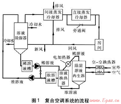 由于長(zhǎng)江流域氣候潮濕,室外空氣濕球溫度較高,比焓、含濕量均大于室內(nèi)設(shè)計(jì)點(diǎn),單獨(dú)使用蒸發(fā)冷卻技術(shù)無(wú)法得到理想的送風(fēng)狀態(tài)參數(shù),需要將蒸發(fā)冷卻與除濕技術(shù)[2~4]聯(lián)合應(yīng)用。因此,本文根據(jù)長(zhǎng)江流域的氣候條件,構(gòu)建了蒸發(fā)冷卻與溶液除濕(采用內(nèi)冷型溶液除濕器及傳統(tǒng)的溶液再生方式)相結(jié)合的復(fù)合空調(diào)系統(tǒng),分析復(fù)合空調(diào)系統(tǒng)的流程。結(jié)合算例,對(duì)復(fù)合空調(diào)系統(tǒng)在長(zhǎng)江流域應(yīng)用的可行性和節(jié)能性進(jìn)行探討。