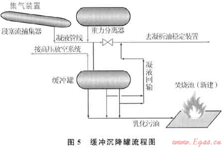 一、二級分離器排出的液體匯合后一起進入緩沖沉降罐,經(jīng)緩沖沉降罐初步穩(wěn)定的油、水混合液輸往下游凝析油穩(wěn)定裝置的三相分離器進行油、氣、水三相分離處理。
