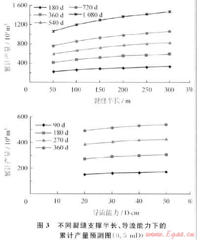 根據(jù)鄰井各氣層解釋結(jié)果,其有效滲透率主要分布于0.3~0.5mD,通過FracproPT軟件模擬,確定不同滲透率對應(yīng)的裂縫參數(shù):最優(yōu)裂縫長度為150~200m,最優(yōu)裂縫導(dǎo)流能力為30D·cm(圖3、4)。