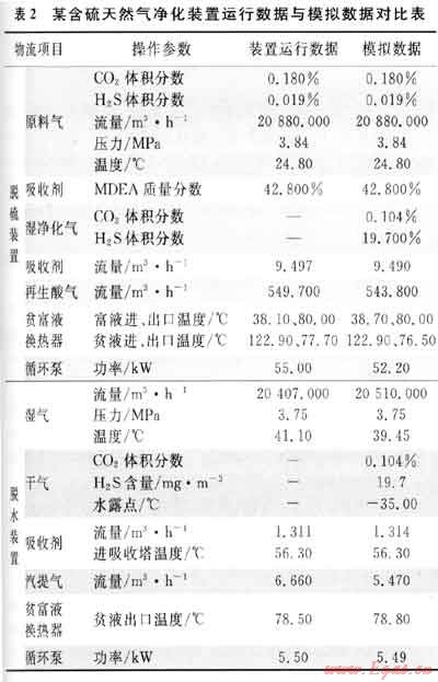 依據(jù)該含硫天然氣凈化裝置的運行數(shù)據(jù),將原料氣及MDEA吸收溶液的參數(shù)輸入凈化裝置工藝模型,調(diào)整模型參數(shù),使輸出干氣氣質(zhì)達(dá)到凈化氣氣質(zhì)標(biāo)準(zhǔn)。表2為某含硫天然氣凈化裝置運行數(shù)據(jù)與模擬數(shù)據(jù)對比表,據(jù)此來驗證所建立的凈化裝置模型的準(zhǔn)確性。