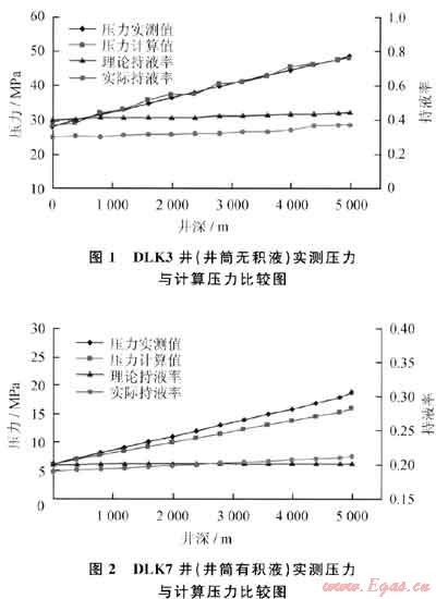利用式(3)選定的模型,筆者在對該區(qū)塊大量井井筒壓力分析計算時發(fā)現(xiàn):①井筒不積液時,計算壓力分布曲線與實測壓力分布曲線吻合較好(圖1),其實際持液率小于理論持液率[2],井筒無積液。大澇壩多口井計算表明,當(dāng)井筒無積液時,其優(yōu)選模型的計算壓力與實測壓力的平均誤差2%。②當(dāng)井筒有積液時,計算壓力低于實測壓力且誤差較大(圖2),其實際持液率小于理論持液率,井筒有積液。