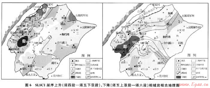 SLSC2層序基準(zhǔn)面下降期對(duì)應(yīng)須五上亞段及須六段沉積期,該時(shí)期屬于龍門山活動(dòng)相對(duì)寧靜期,古地形相對(duì)變緩,沉積體系演變?yōu)橐匀侵?淺湖沉積為主,須五段早期的辮狀河三角洲向曲流河三角洲演變,湖盆中心位于彭山-射洪一線,呈北東向展布,明顯受古龍門山控制。三角洲前端淺湖砂壩及河口壩較湖盆擴(kuò)張期規(guī)模亦明顯變小,主要由龍門山前緣川西坳陷北段安縣-中壩地區(qū),米倉山-大巴山前萬源-宣漢、川東南川-重慶、川南宜賓-威遠(yuǎn)地區(qū)提供物源并發(fā)育規(guī)模相對(duì)較小的三角洲沉積。受晚印支運(yùn)動(dòng)影響,盆地北部安縣-劍閣一帶須五段沉積后隆升剝蝕缺失,須六段無沉積。