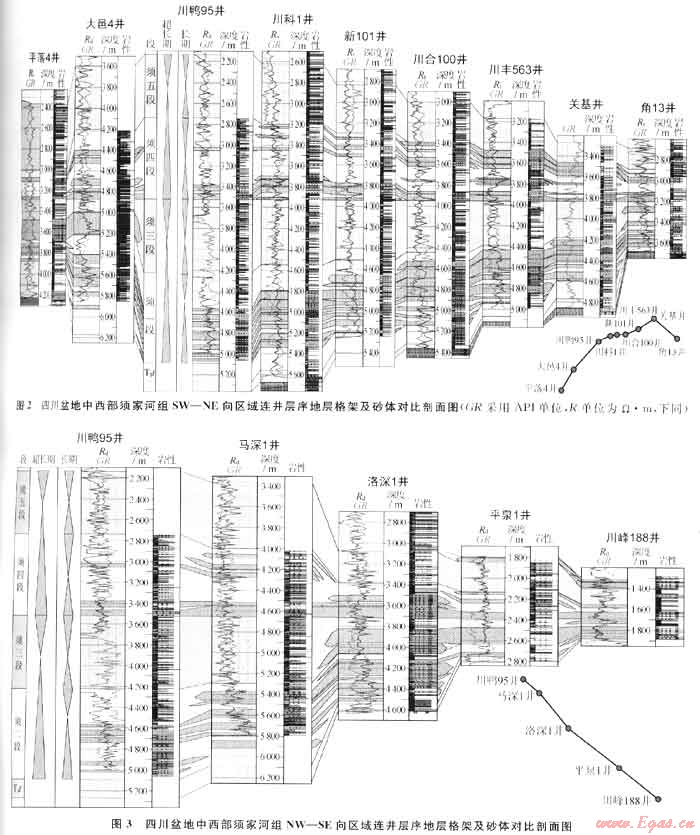 四川盆地須家河組2個(gè)超長期旋回分別對(duì)應(yīng)于須家河早期(以安縣運(yùn)動(dòng)侵蝕面為界[3],沉積T3x2-T3x3,俗稱須下盆)和須家河晚期(沉積T3x4-T3x6,俗稱須上盆)2個(gè)成盆期構(gòu)造層序。長期基準(zhǔn)面旋回與vail經(jīng)典層序理論中的Ⅲ級(jí)層序相當(dāng),是一套具較大水深變化幅度的、彼此間具成因聯(lián)系的地層所組成的區(qū)域性湖進(jìn)湖退沉積序列,可稱為沉積層序,5個(gè)長期旋回層序宏觀上對(duì)應(yīng)于須二、須三、須四、須五、須六段。