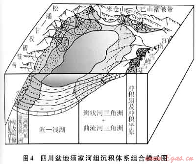 沖積扇-河流(沖積平原)-曲流河或辮狀河三角洲-湖泊沉積模式是四川盆地上三疊統(tǒng)的主體沉積樣式。以龍門山及米倉山-大巴山為主的沖斷推覆構(gòu)造帶是前陸盆地主要物源區(qū),盆地邊緣廣泛發(fā)育沖積扇,并連接或疊覆構(gòu)成沖積扇群,逐漸過渡到河流、沖積平原,并在河流入湖處形成三角洲或辮狀河三角洲相沉積,在與物源相距較遠(yuǎn)、古地形比較平緩背景下形成曲流河三角洲,在造山帶前緣坡度較陡區(qū)域辮狀河入湖形成辮狀河三角洲,后者主要位于須四段上部。