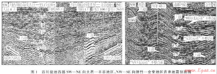 受資料限制,多數(shù)學(xué)者沉積相分析主要來自于地表露頭及鉆井資料,地震層序分析是獲得本文不同于前期地質(zhì)認(rèn)識(shí)的重要依據(jù),主要線索包括地震剖面上地層厚度變化關(guān)系、層間接觸關(guān)系,層段內(nèi)砂體或砂層組分布及疊加樣式等。主要選取了與龍門山或川西坳陷平行、垂直的NE向和NW 向區(qū)域二三維地震剖面進(jìn)行層序格架與砂體疊加樣式分析。