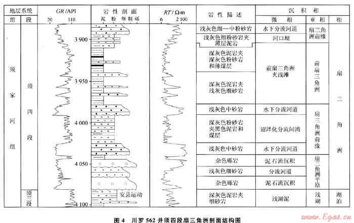 發(fā)育于龍門山和米倉(cāng)山-大巴山兩造山帶前緣的須四段和須五段,成因與出山口的沖積扇直接入湖有關(guān),屬于近源粗碎屑三角洲,因而無論是在平面上還是在剖面上,均表現(xiàn)為沖積扇與湖相沉積物交替組合構(gòu)成的進(jìn)積→加積→退積復(fù)合體??蓜澐譃樯热侵奁皆?、扇三角洲前緣、前扇三角洲3個(gè)亞相及眾多微相類型(圖4):