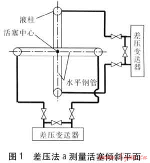 差壓法a測(cè)量活塞傾斜平面見圖1。在活塞上采用鋼管做兩個(gè)大的水平尺,互相垂直異面交叉,不連通,交叉點(diǎn)為活塞的中心位置。鋼管內(nèi)充有低揮發(fā)性的專用油品,每根鋼管兩端各有一個(gè)立管,管內(nèi)充有一定高度的液注,同一根鋼管的兩個(gè)立管下部分別與差壓變送器的正負(fù)壓室相連,根據(jù)液柱高差,可計(jì)算得出該方向傾斜量的大小。差壓變送器鄰近測(cè)壓點(diǎn)安裝。