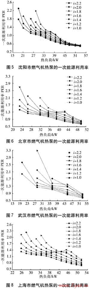 由圖5~8可知:①在供暖季節(jié)使用燃?xì)鈾C(jī)熱泵,若采用單級傳動比,則高傳動比時的一次能源利用率比較低。即傳動比越大,燃?xì)鈾C(jī)熱泵的運(yùn)行越不經(jīng)濟(jì)。②相同傳動比的燃?xì)鈾C(jī)熱泵,其一次能源利用率隨緯度的升高而降低。③熱負(fù)荷較小時,低傳動比燃?xì)鈾C(jī)的輸出功率無法滿足壓縮機(jī)的功率需求,此時燃?xì)鈾C(jī)會熄火甚至無法啟動。只有通過增大燃?xì)鈾C(jī)的節(jié)氣門開度,提高燃?xì)鈾C(jī)的轉(zhuǎn)速來滿足需要的熱負(fù)荷,但此時燃?xì)鈾C(jī)已處于高速低效工作區(qū),機(jī)組的經(jīng)濟(jì)性較差。④當(dāng)熱負(fù)荷較小時,燃?xì)鈾C(jī)熱泵的一次能源利用率較高,原因是:a.工作環(huán)境改善使熱泵的供熱系數(shù)比較高;b.當(dāng)熱負(fù)荷較小、燃?xì)鈾C(jī)轉(zhuǎn)速較低時,供熱量中回收的燃?xì)鈾C(jī)余熱比例較大;c.當(dāng)熱負(fù)荷最大時,燃?xì)鈾C(jī)熱泵在4個城市中的一次能源利用率都比較低,約為0.6~0.8,但這種惡劣極端天氣的時間在供暖期中所占的比例很小。d.在熱負(fù)荷為30~40kW(供暖時間比較集中)時,采用不同單級傳動比的燃?xì)鈾C(jī)熱泵,其一次能源利用率較高,基本都大于1.2。