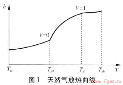 天然氣液化放熱的溫度-比焓(即T-h)曲線由3段平滑曲線組成,分割放熱曲線的點(diǎn)的相應(yīng)溫度是露點(diǎn)Tg1(氣化率V=1)及泡點(diǎn)Tg0(此時(shí)氣化率V=0),此2點(diǎn)也是曲線的2個(gè)拐點(diǎn)。天然氣放熱曲線見圖1。
