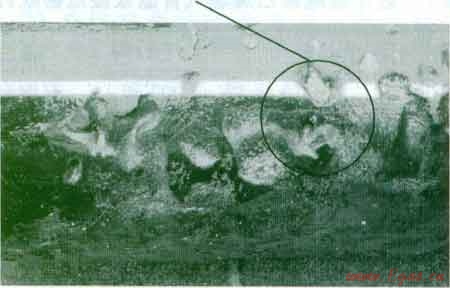 2012年4月,我公司接報(bào)坪山某路段有燃?xì)庑孤?。?jīng)現(xiàn)場(chǎng)檢測(cè)確認(rèn)泄漏部位后,進(jìn)行開挖探查。該段為聚乙烯管道,緊鄰路燈,隨橋跨河敷設(shè),埋深約80 crn,且周邊土壤較為潮濕,管道外加鋼質(zhì)套管保護(hù)。開挖后發(fā)現(xiàn)PE管道與鋼質(zhì)套管的間隙被白蟻蟻巢填滿(見(jiàn)圖l)。經(jīng)現(xiàn)場(chǎng)清理后發(fā)現(xiàn)該段PE燃?xì)夤艿朗馨紫佒g大面積破壞,并確認(rèn)燃?xì)庾园紫佒g破壞穿孔處泄漏(見(jiàn)圖2)。