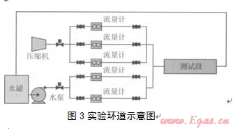 實(shí)驗(yàn)室的實(shí)驗(yàn)環(huán)道如圖3所示,實(shí)驗(yàn)系統(tǒng)采用GA45VSD型全封閉低噪聲螺桿式空氣壓縮機(jī),其額定功率為45 kW,最大工作壓力為l.3 MPa,排氣量為78~354 m3/h。水泵采用ZS65—40—200離心泵,量程為25 m3/h,揚(yáng)程為62 m。氣體計(jì)量采用Y040一EALSS4 0D渦旋流量計(jì)。液體流量計(jì)量采用Emer—son CMF型質(zhì)量流量計(jì)。實(shí)驗(yàn)環(huán)道口徑為40 mm,測試段外徑為200 mm,壁厚為l5 mm。