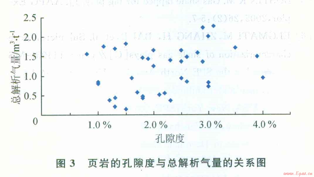 圖3是頁巖氣的總解析氣量與頁巖的孔隙度的關系圖,從圖中可以看到該頁巖氣藏的孔隙度與總解析氣量并沒有明顯關系。圖4是頁巖的總解析氣量與TOC關系圖,從圖中可以看到兩者存在著明顯的正相關關系,隨著頁巖的有機質含量的增加,頁巖的總解析氣量也是增加的。美國5大頁巖具有豐富的有機質含量,其TOC大多介于l.5%~20%,通常認為總有機質含量超過0.5%的頁巖是具有潛力的烴源巖。通過對該頁巖氣藏巖心的有機地化分析,其TOC介于0.5%~5%,其TOC使其可能成為具有潛力的烴源巖。根據(jù)美國和加拿大的勘探開發(fā)結果,對于熱成因的頁巖氣藏,形成頁巖氣的頁巖有機質成熟度(R。,)值為0.4%~3.o%。陔頁巖氣藏的R。值范圍為2.75%~3.92%,R。值超過3%說明處于過成熟范圍,會影響頁巖氣體的吸附量。