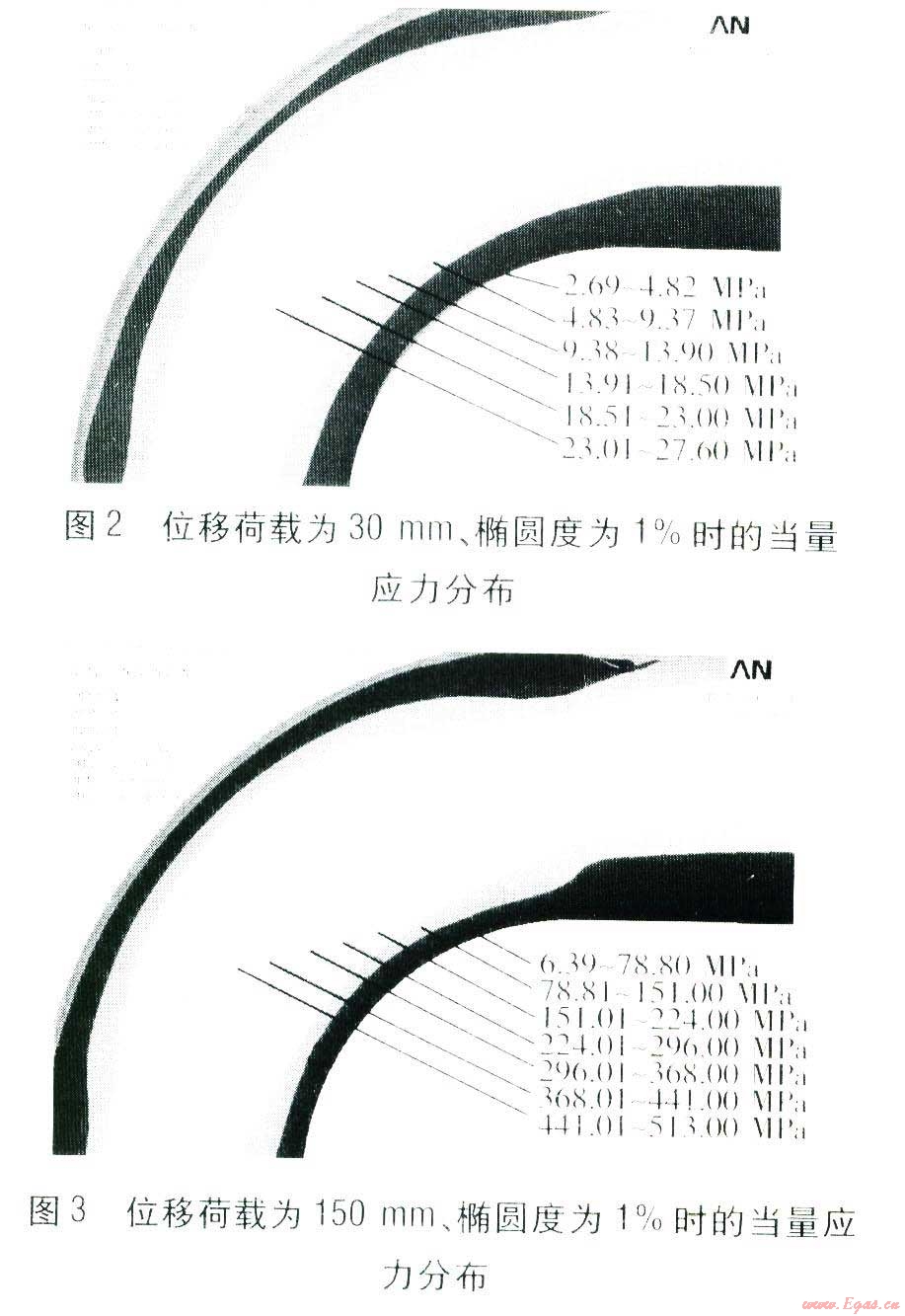 最高循環(huán)溫度為130℃,安裝溫度為l0℃,彎管內(nèi)表面施加l.6 MPa的壓力荷載。在對直臂施加不同位移荷載,以及不同橢圓度下對彎頭的當(dāng)量應(yīng)力分布進行模擬。直臂分別施加l0、30、50、80、150、200 mm的位移荷載,橢圓度變化范圍為l%~20%。位移荷載分別為30、150mm、橢圓度為1%時的當(dāng)量應(yīng)力分布見圖2、3,各個色塊的當(dāng)量應(yīng)力范圍標(biāo)注在圖中。由圖2、3可知,彎頭中線部位當(dāng)量應(yīng)力最大。在對直臂施加不同位移荷載時,彎頭中線部位當(dāng)量應(yīng)力不同。對直臂施加的位移荷載越大,彎頭所受當(dāng)量應(yīng)力越大。