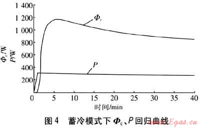 由實驗結(jié)果擬合的蓄冷模式下Φc、P回歸曲線見圖4。由圖4可知,在壓縮機開機的第1min,由于制冷循環(huán)剛開始,而且換熱過程也需要消耗時間,因此換熱器進出水溫度相差不大,Φc也很小。在運行過程中P隨著冷凝壓力、蒸發(fā)壓力的下降而逐漸降低。