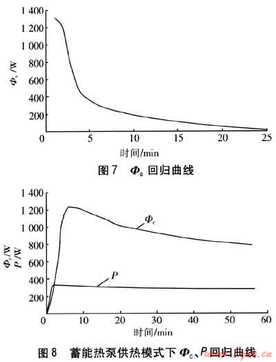 由實驗結(jié)果擬合的蓄能熱泵供熱模式下Φc、P回歸曲線見圖8。與蓄冷模式相比較,由于冷凝溫度的升高,壓縮機的功率增大。Φc的變化趨勢與蓄冷模式類似,但是由于初始溫度高于蓄冷模式,相變材料相應(yīng)可提取的液態(tài)顯熱量增加。因此,蓄能熱泵供熱模式在達到與蓄冷模式相同的蒸發(fā)壓力水平時,所用時間相應(yīng)延長。