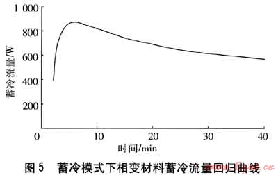 Φc與P之差即為相變材料蓄冷流量(回歸曲線見圖5),由于前2min實驗數(shù)據(jù)不穩(wěn)定且存在Φc<P的情況,因此曲線從第2min給出。隨著運行時間的推移,壓縮機逐漸穩(wěn)定運行,制冷劑與相變材料的換熱流量不斷增大,初期提取的熱量為液態(tài)相變材料的液相顯熱,當(dāng)相變材料溫度進入相變區(qū)間時,制冷劑取出的熱量為相變潛熱。