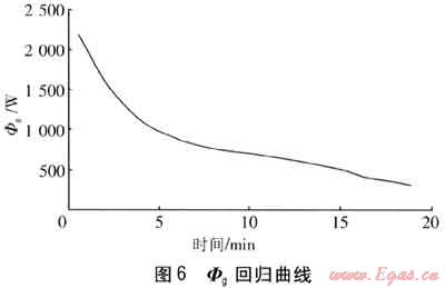 在蓄冷完成后,壓縮機停機,立即開始取冷實驗。由實驗結(jié)果擬合的Φg回歸曲線見圖6。由圖6可知,取冷實驗持續(xù)時間為19min,在5~11min,Φg的變化相對前后兩個時間段要平緩,因此這一時段相變材料處于相變釋冷階段。在19min后,由于相變材料與熱水的溫差較小,因此釋冷緩慢,此時取冷量已經(jīng)達到蓄冷量的90%??紤]到取冷時間較短,以及存在熱損失等因素影響,因此可以基本認(rèn)定:三套管相變蓄能換熱器在蓄釋能過程中能量是基本守恒的。